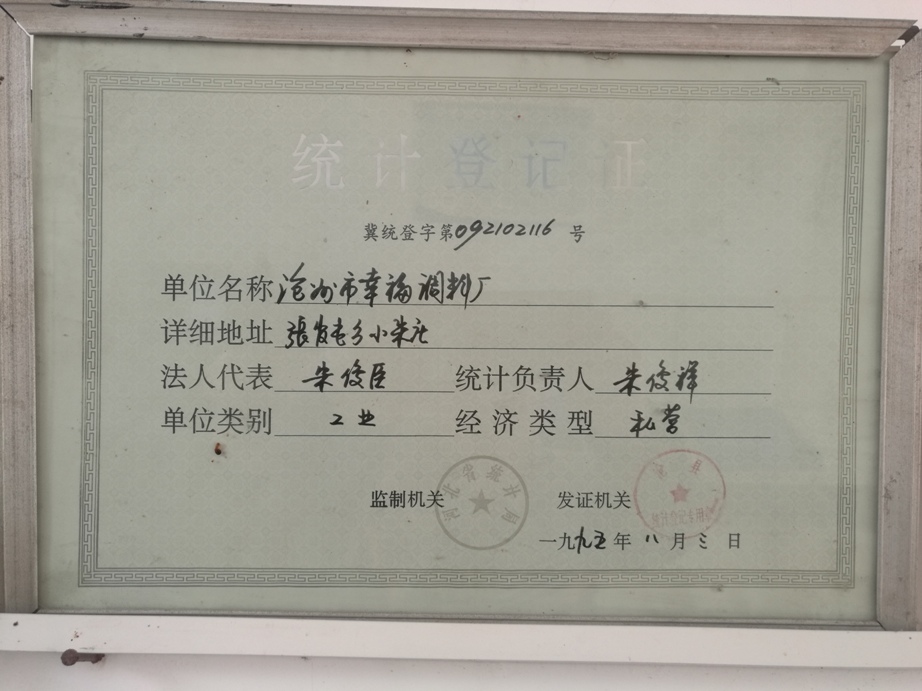 統(tǒng)計(jì)登記證 冀統(tǒng)登字第092102116號 單位名稱滄州市幸福調(diào)料廠 詳細(xì)地址張官屯鄉(xiāng)小朱莊 發(fā)證機(jī)關(guān):滄縣統(tǒng)計(jì)局 監(jiān)制機(jī)關(guān):河北省統(tǒng)計(jì)局 一九九五年八月三日